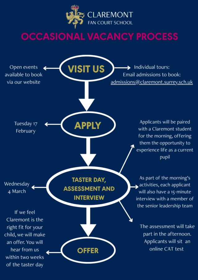 If you would like to talk through the process or have any questions at all, please do not hesitate to contact Aline Norris in our admissions team, by email on admissions@claremont.surrey.sch.uk or by telephone on 01372 473 780.