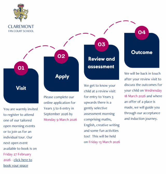 We are always happy to help with any questions you might have. Please get in touch with Mrs Jo Bramley directly by email at admissions@claremont.surrey.sch.uk or by phone on 01372 473761.