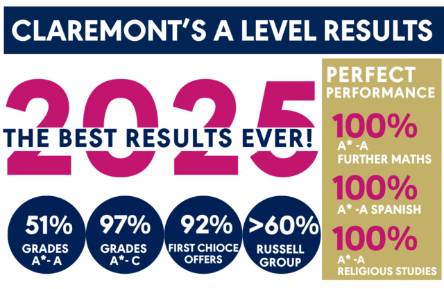 This year Claremont introduced a three-year GCSE study model, meaning pupils have the time to build deep understanding, explore enrichment opportunities and develop creativity and personal skills. This structure also gives pupils space to be stretched in an academically deeper and more meaningful way building skills and knowledge beyond GCSE. The result is a stronger stepping stone for A level study, greater confidence, sustained academic progress and exceptional outcomes. Ultimately, this story is not just about grades, it is about the journeys behind them: talented young people who are ready to embrace every opportunity the world presents.